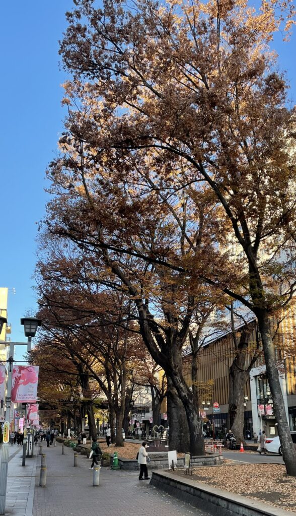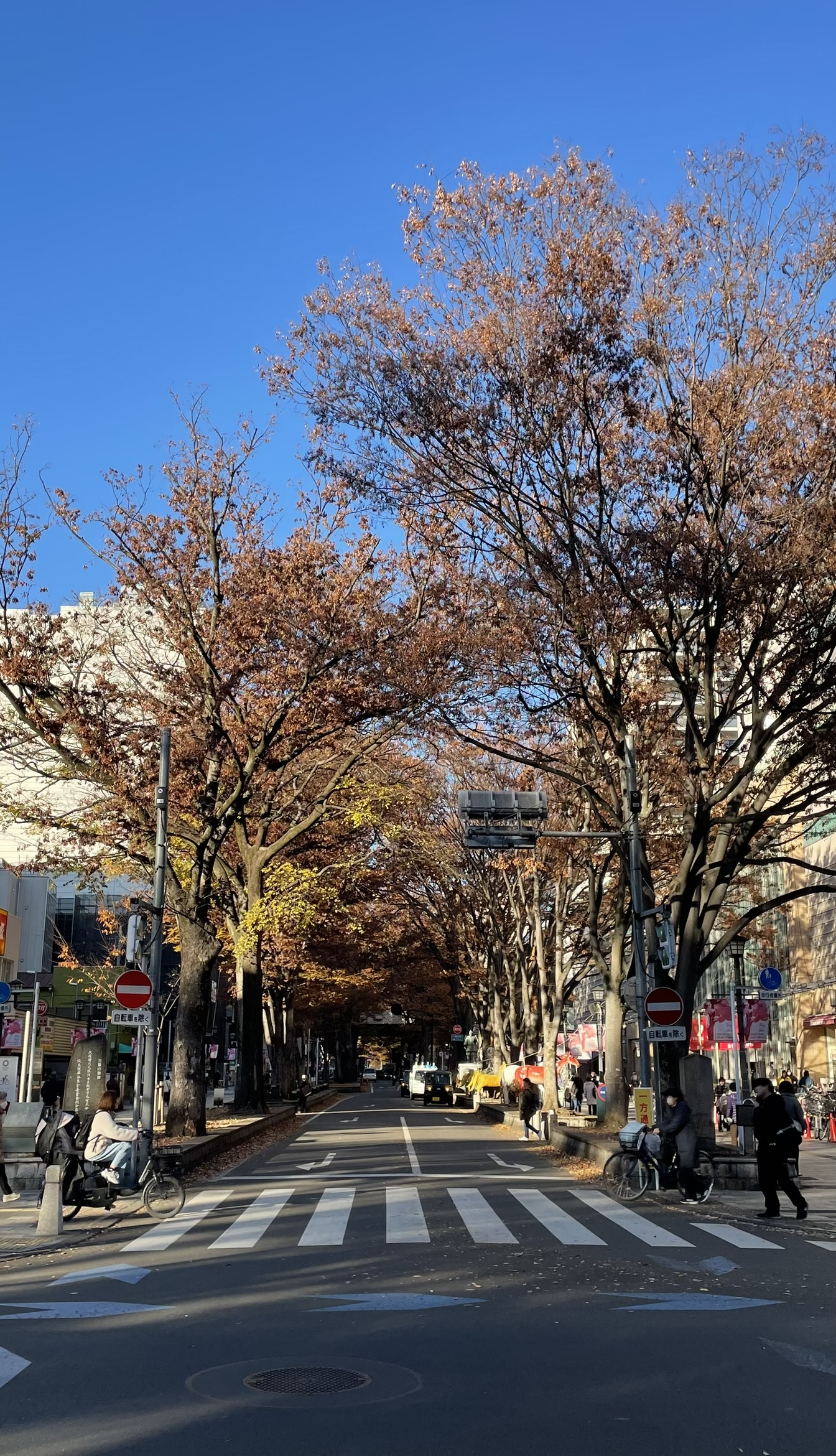起源は江戸時代とも平安時代とも言われる長い歴史を持つけやき並木は、この時期は美しい紅葉に彩られている。