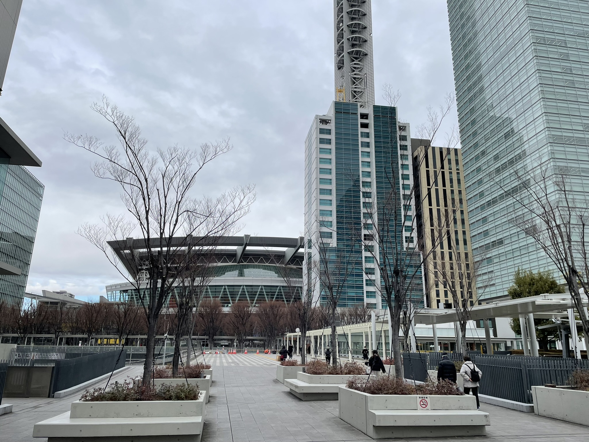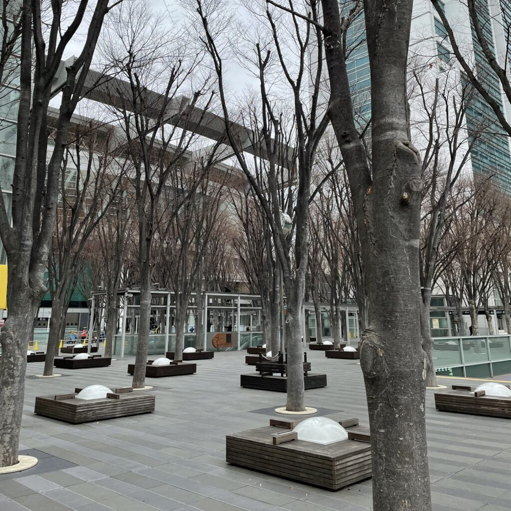 チューブ型の屋根が特徴的なコンコースを抜けると、その先にペデストリアンデッキの歩行空間が広がる。